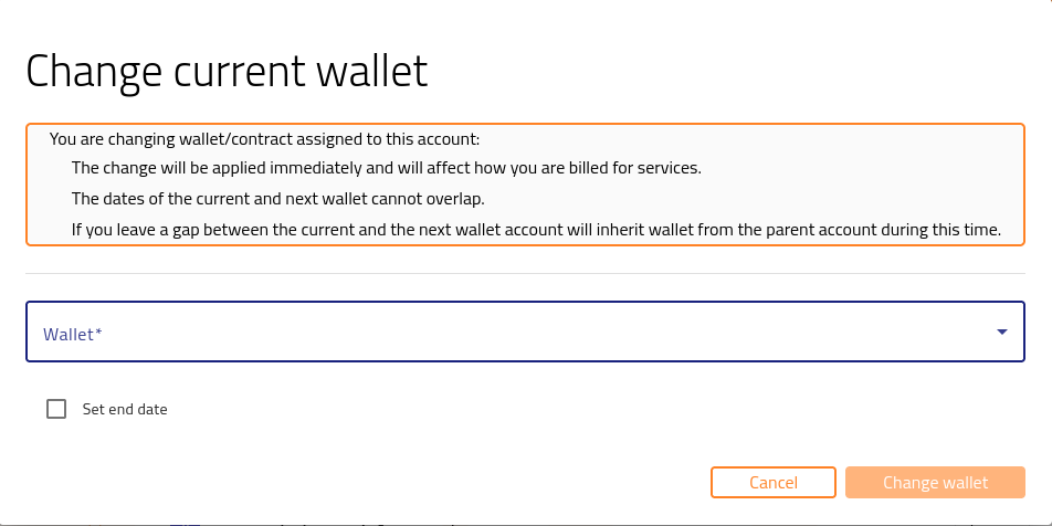 The change of wallet takes effect immediately and affects how you are billed for services.