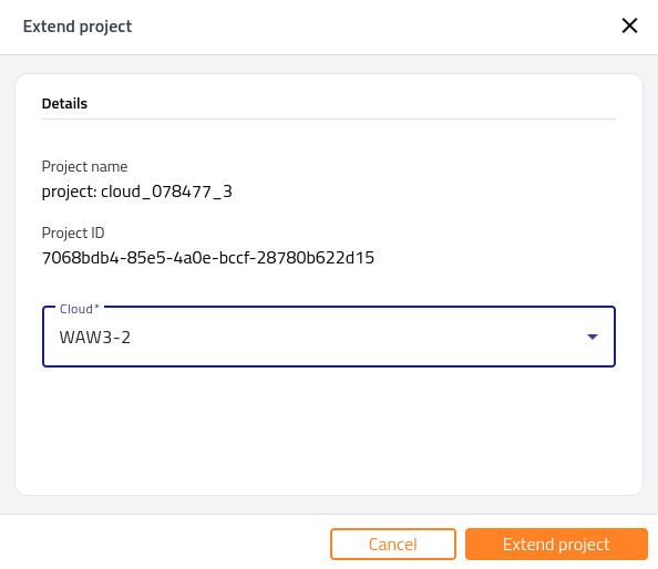 Select Extend project to make an existing project available in another region.